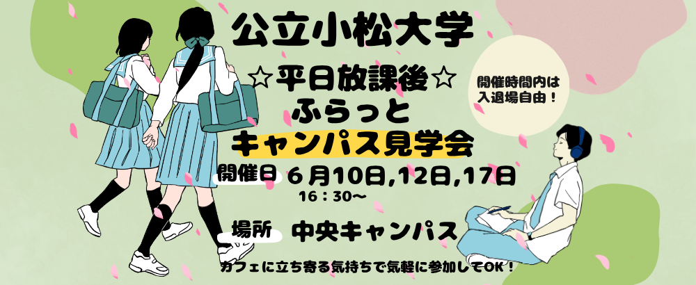 NEWS一覧を見る すべて イベント ニュース ニュース2026年4月28日 平日放課後☆ふらっとキャンパス見学会2026春を開催します! イベント2026年4月24日 【公立小松大学協力会】公立小松大学理事長による特別講演会「再... 研究 2026年4月17日 国際文化交流学科の小原 文衛 教授の共編著『ホラーの機能 迂... ニュース2026年4月17日 オークランド大学ELA(ニュージーランド)英語研修に本学の学... 研究 2026年4月16日 臨床工学科4年(受賞当時)の中里 美憂さんが計測自動制御学会... 研究 2026年4月15日 生産システム科学科 朴 亨原 准教授を筆頭著者とする論文が、... ニュース2026年4月10日 ヨーロッパ世界遺産研修に本学の学生11名が参加しました イベント2026年4月24日 【公立小松大学協力会】公立小松大学理事長による特別講演会「再... イベント2026年3月 6日 公立小松大学次世代考古学研究センター・セミナーシリーズ第6回... イベント2026年1月 9日 【公立小松大学協力会共催】第3回若手教員研究成果報告会「ヒト... イベント2025年11月28日 新キャンパス一般見学会&市民公開フォーラム2025「スポーツ... イベント2025年10月 8日 【参加者募集】11/22(土)開催 新キャンパス一般見学会&... イベント2025年9月 8日 10/18(土)、19(日)第8回公立小松大学祭「青松祭」を... ニュース2026年4月28日 平日放課後☆ふらっとキャンパス見学会2026春を開催します! 研究 2026年4月17日 国際文化交流学科の小原 文衛 教授の共編著『ホラーの機能 迂... ニュース2026年4月17日 オークランド大学ELA(ニュージーランド)英語研修に本学の学... 研究 2026年4月16日 臨床工学科4年(受賞当時)の中里 美憂さんが計測自動制御学会... 研究 2026年4月15日 生産システム科学科 朴 亨原 准教授を筆頭著者とする論文が、... ニュース2026年4月10日 ヨーロッパ世界遺産研修に本学の学生11名が参加しました 一覧を見る 入試情報一覧を見る 入試 2026年4月 6日 業者主催の進学ガイダンス(4~7月)の参加状況について 入試 2026年4月 6日 令和8年度(2026年度)入学者選抜実施結果について 入試 2026年3月26日 令和9年度(2027年度)入学者選抜における外国人留学生特別選抜の新設について(予告) 入試 2026年3月19日 令和8年度公立小松大学入学者選抜〔一般選抜(中期日程)〕の理科の出題ミスについて 入試 2026年3月17日 【大学院】令和8(2026)年度 サステイナブルシステム科学研究科(博士後期課程)ヘルスケアシステム科学専攻第2期募集(一般選抜・社会人特別選抜)の合格者について 入試 2026年3月17日 【大学院】令和8(2026)年度 サステイナブルシステム科学研究科(博士前期課程)ヘルスケアシステム科学専攻第2期募集(一般選抜・社会人特別選抜)の合格者について 入試 2026年4月 6日 令和8年度(2026年度)入学者選抜実施結果について 入試 2026年4月 6日 業者主催の進学ガイダンス(4~7月)の参加状況について 入試 2026年3月26日 令和9年度(2027年度)入学者選抜における外国人留学生特別選抜の新設について(予告) 入試 2026年3月19日 令和8年度公立小松大学入学者選抜〔一般選抜(中期日程)〕の理科の出題ミスについて 入試 2026年3月17日 【大学院】令和8(2026)年度 サステイナブルシステム科学研究科(博士後期課程)ヘルスケアシステム科学専攻第2期募集(一般選抜・社会人特別選抜)の合格者について 一覧を見る 公立小松大学 大学憲章 公立小松大学基金 教職員採用情報 公立小松大学同窓会
