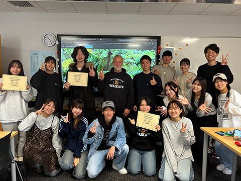 私はニュージーランド・ワイカト大学で3週間の語学研修に参加しました。このプログラムでは、授業やホームステイを通じて英語を日常的に使う機会が多くありました。平日の午前は主に毎時間設定するトッピクについてのライティング、教科書を使用したリーディング・リスニングを学びました。午後からは、ペア・グループ別でのディスカッションやゲームなどスピーキングの練習をしました。放課後は課外イベントに参加したり、友達とバスを利用してカフェや雑貨屋さんに行ったりしました。クラスメイトや他学部の学生との交流を通して、英語でのコミュニケーション能力を高めるだけでなく、多様な文化や価値観を持つ人々への理解も深めることができました。