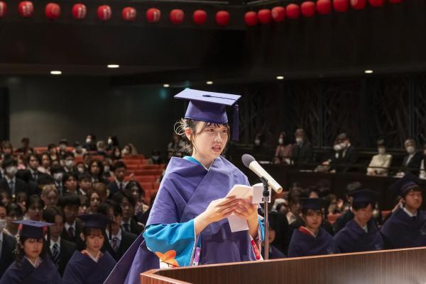 その後、臨床工学科の野崎桜花さんが卒業生を代表して挨拶し、新型コロナウイルスの感染拡大で様々な制限がある中でも、学科の仲間と勉学に励んだり、学年学科を超えたメンバーで大学祭を実施したりすることで視野を広げることができたと述べました。また、大学院サステイナブルシステム科学研究科生産システム科学専攻の池田理玖さんが修了生を代表して挨拶し、大学院の第一期生という開拓者としての誇りを胸に切磋琢磨の日々を過ごし、学問を深めることができたと述べました。